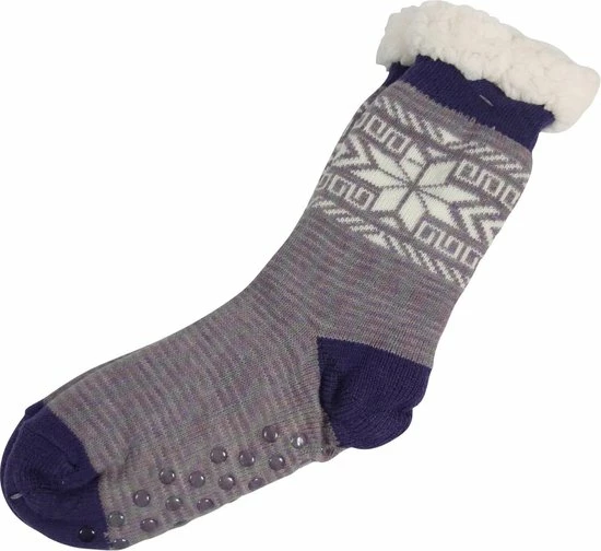Gevoerde paars/mauve melange huissokken met paarse teen en hiel, wit noors motief met sneeuwvlok aan de bovenzijde, en antislip aan de onderzijde zodat deze ook op gladde vloeren gedragen kunnen worden. Maat 36-41.