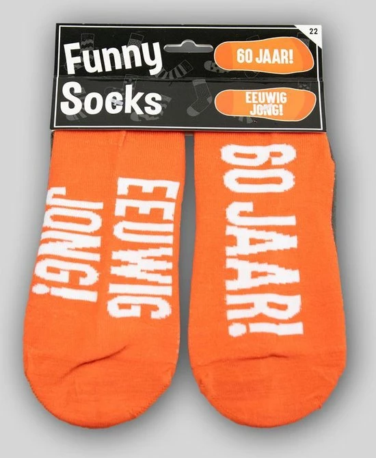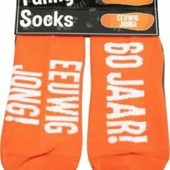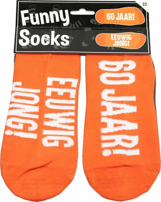 Funny socks met de tekst: ’60 Jaar! Eeuwig jong!’ van het merk Paperdreams. Deze sokken past bijna iedereen.