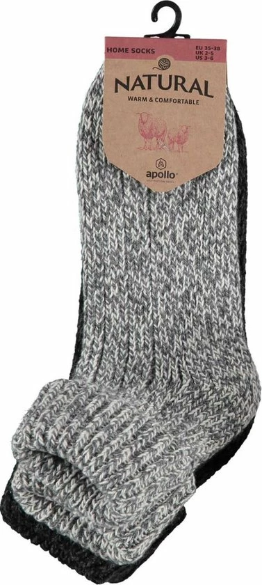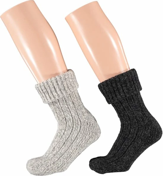 2 paar wollen dames huissokken met zeer breed boord waardoor deze langer te dragen zijn of met een omslag . Gemaakt van 30% schapenwol, 50% acryl, 18% polyamide en 2% elastaan