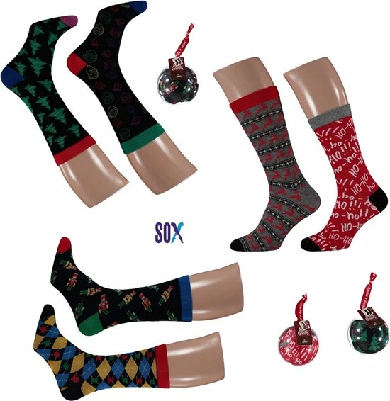 6 paar leuke kerstsokken met kerstprint verpakt in kerstbal per 2 paar.