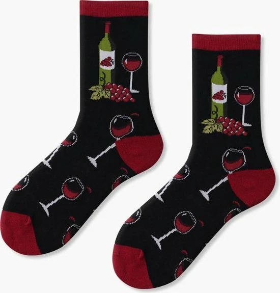 Leuk voor de wijnliefhebber! Een stel grappige sokken met hierop wijnflessen, glazen en druiven.